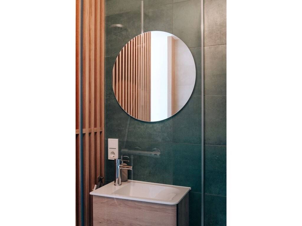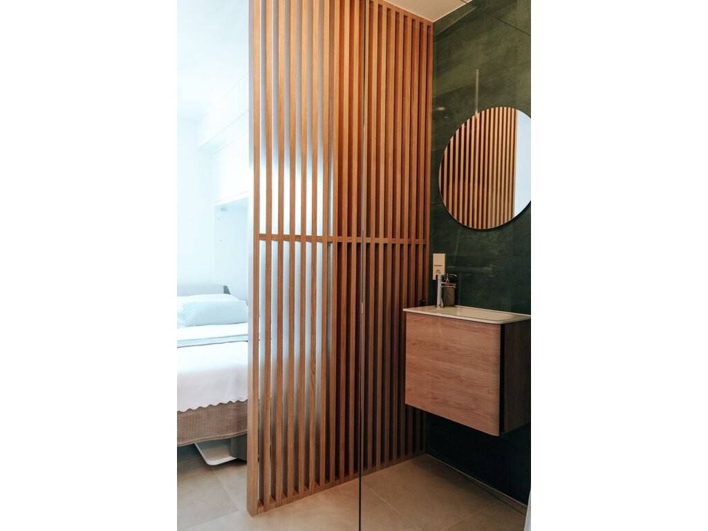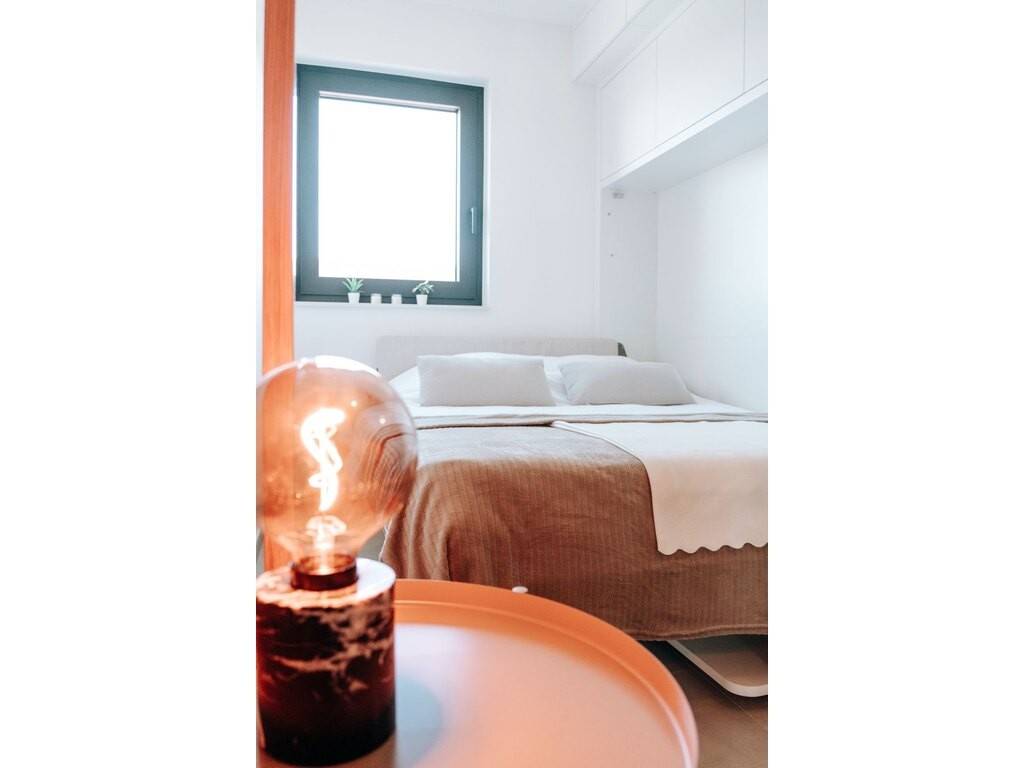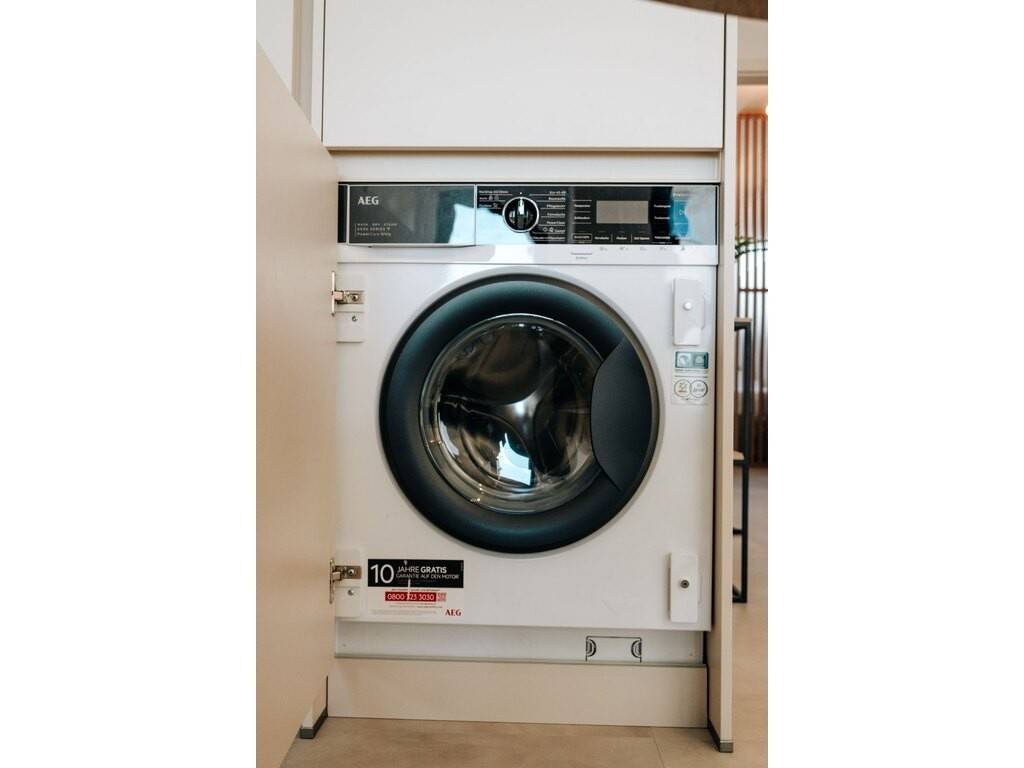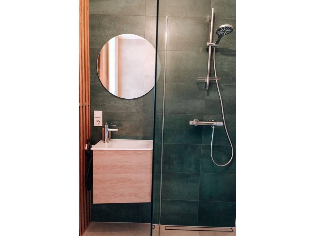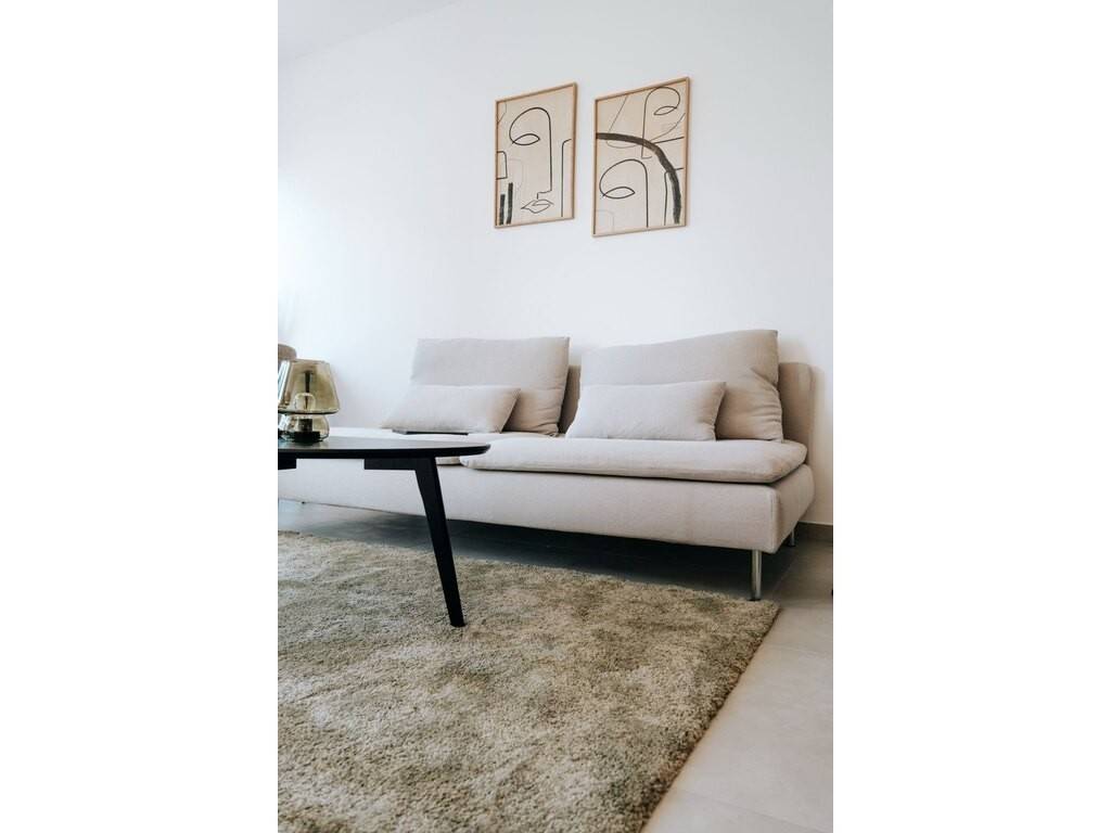 Im 3. Stock befindet sich die Eingangstür, die in eine Halle führt, die auf einer Seite ein Wohnzimmer und eine Büroecke beherbergt. Die Wohnung hat eine offene Küche mit Backofen, Geschirrspüler und Waschmaschine/Trockner und auf der anderen Seite ein Schlafzimmer mit einem Bett, das in einem maßgefertigten Möbelstück integriert ist, mit Schreibtisch und Stauraum und ein Duschbad (Dusche, Waschbecken). Die Wohnung hat außerdem eine separate Toilette.