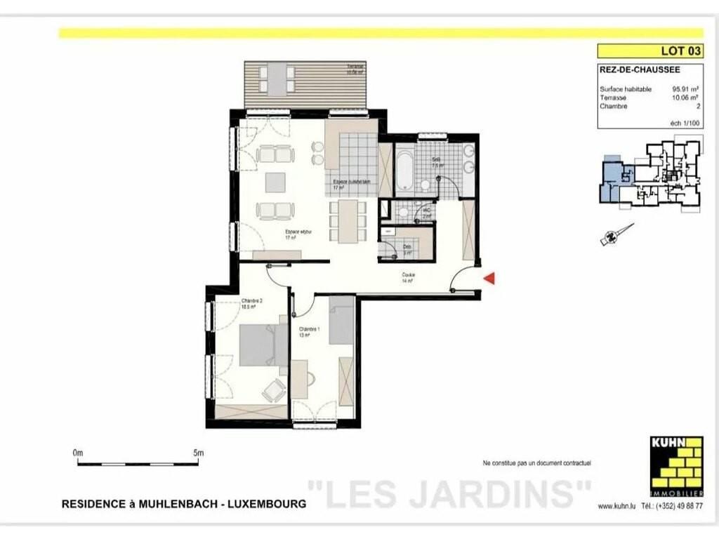 Diese Wohnung im Erdgeschoss der Residenz besteht aus zwei Schlafzimmern von 13m2, einem Duschbad mit WC, einem Wohnzimmer mit offener Einbauküche und einem Abstellraum, ergänzt durch eine 10m2 große Terrasse mit Westausrichtung.