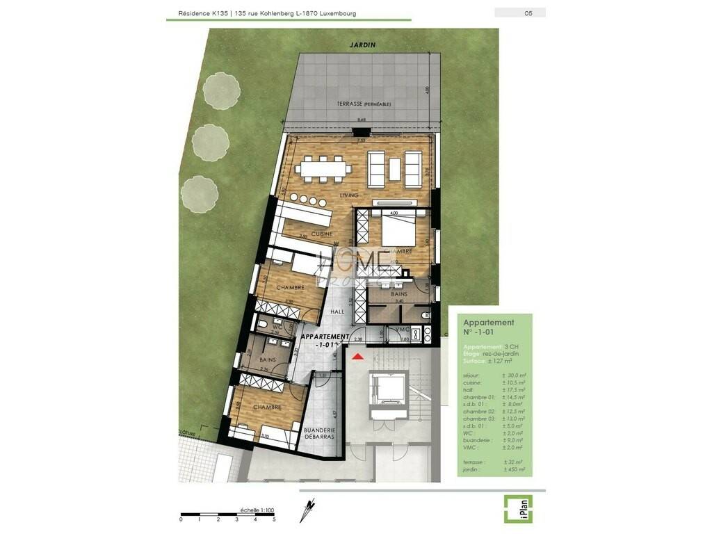 Entdecken Sie Lot 1, eine außergewöhnliche Wohnung im Gartengeschoss der neuen Residenz "K135", die sich durch ihre moderne und schlichte Architektur auszeichnet. Diese kleine Luxus-Eigentumswohnung befindet sich in idealer Lage in einem beliebten Wohnviertel, nur wenige Schritte von der Cloche d'Or, den Autobahnanschlüssen, den öffentlichen Verkehrsmitteln und allen Annehmlichkeiten entfernt.