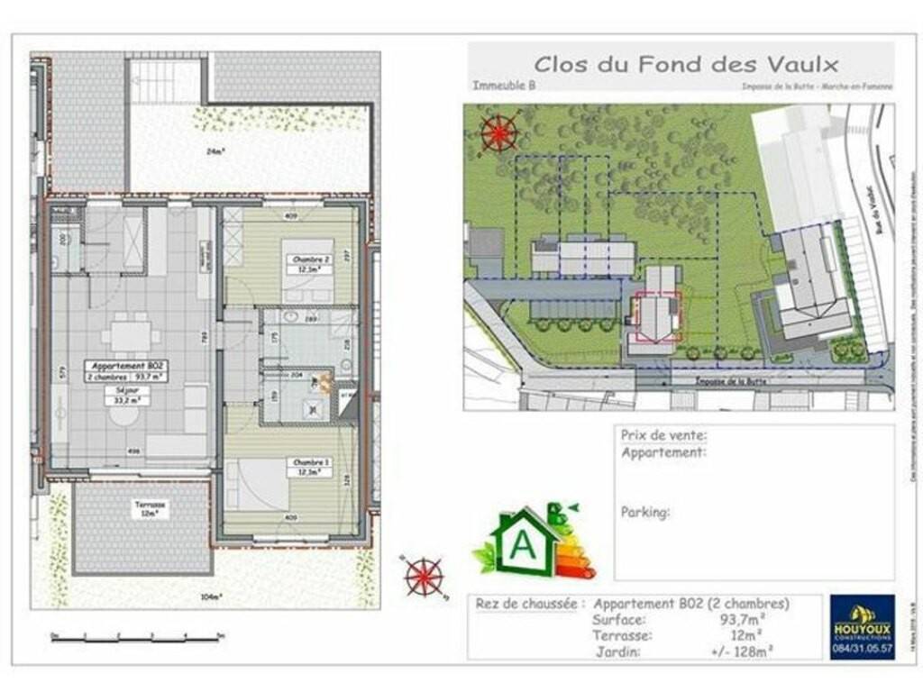 Au Clos du Fond des Vaulx, avoisinant le site naturel du Fond des Vaulx, venez découvrir cet appartement de 93,70m². Idéalement situé à quelques pas du centre-ville de Marche-en-Famenne, cet appartement est pourvu d'une excellente isolation thermique et acoustique. Il est doté d'une chaudière individuelle au gaz, de doubles vitrages, d'une alarme anti-intrusion, d'un système de ventilation double flux, d'une cuisine totalement équipée, d'une salle-de-douche, d'un WC séparé, d'une terrasse de 12m² et d'un jardin de 104m². Il est accessible directement depuis l'extérieur (sans hall commun à la résidence), ce qui rend votre entrée privative et limite les charges communes. Possibilité d'acquérir, en supplément, une place de parking.