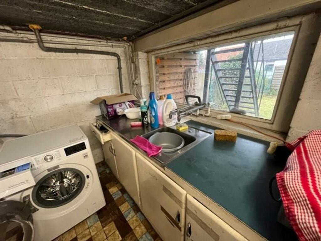 Elle se compose d’un grand séjour lumineux, d’une cuisine semi-équipée sans taque de cuisson, frigo et four emplacement prévu pour lave-vaisselle. La cuisine donne accès à la terrasse et au jardin. Une toilette séparée au RDC.