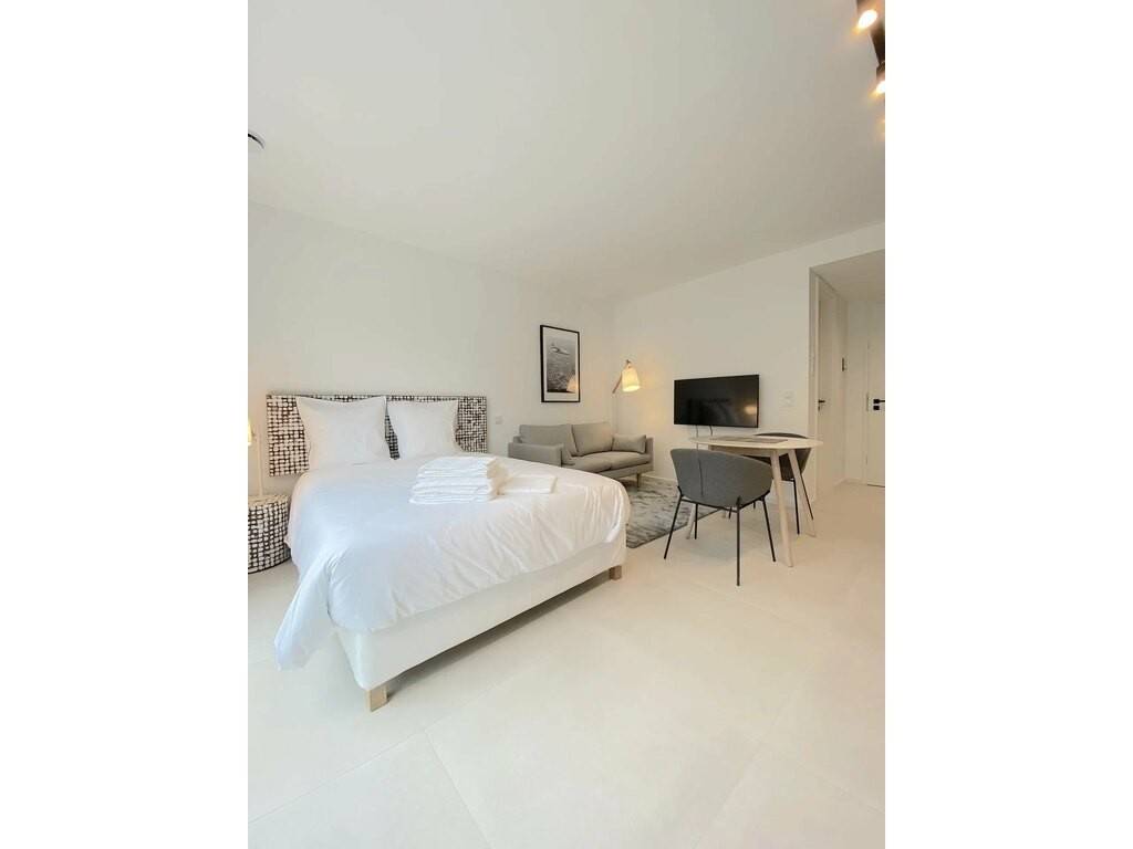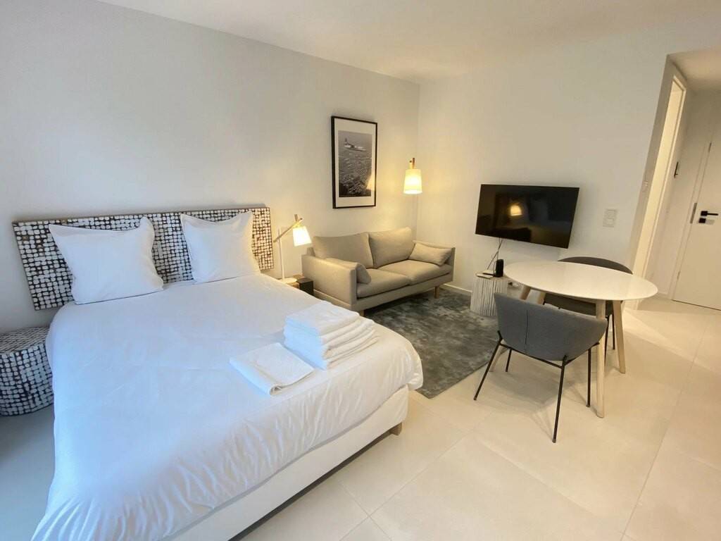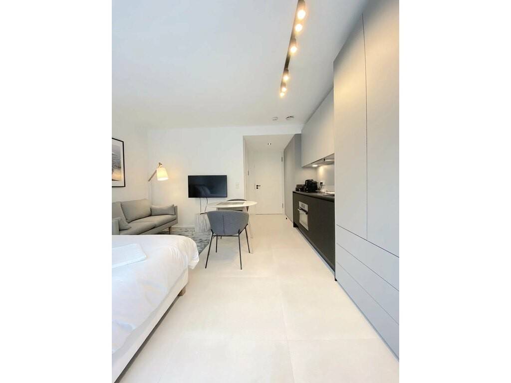 Obwohl es sich um ein Studio handelt, gibt es klar getrennte Wohn-, Schlaf- und Küchenbereiche. Der an der Wand montierte Fernseher ist schwenkbar, sodass Sie ihn vom Bett, Sofa oder der Küche aus sehen können.