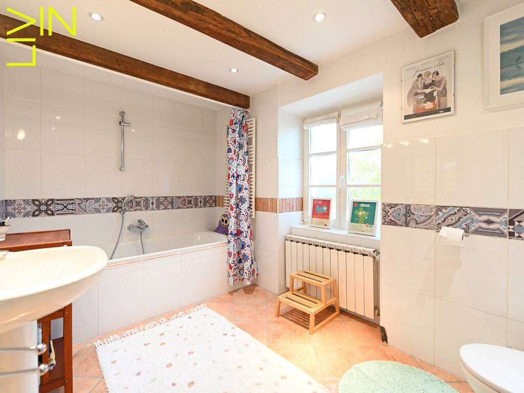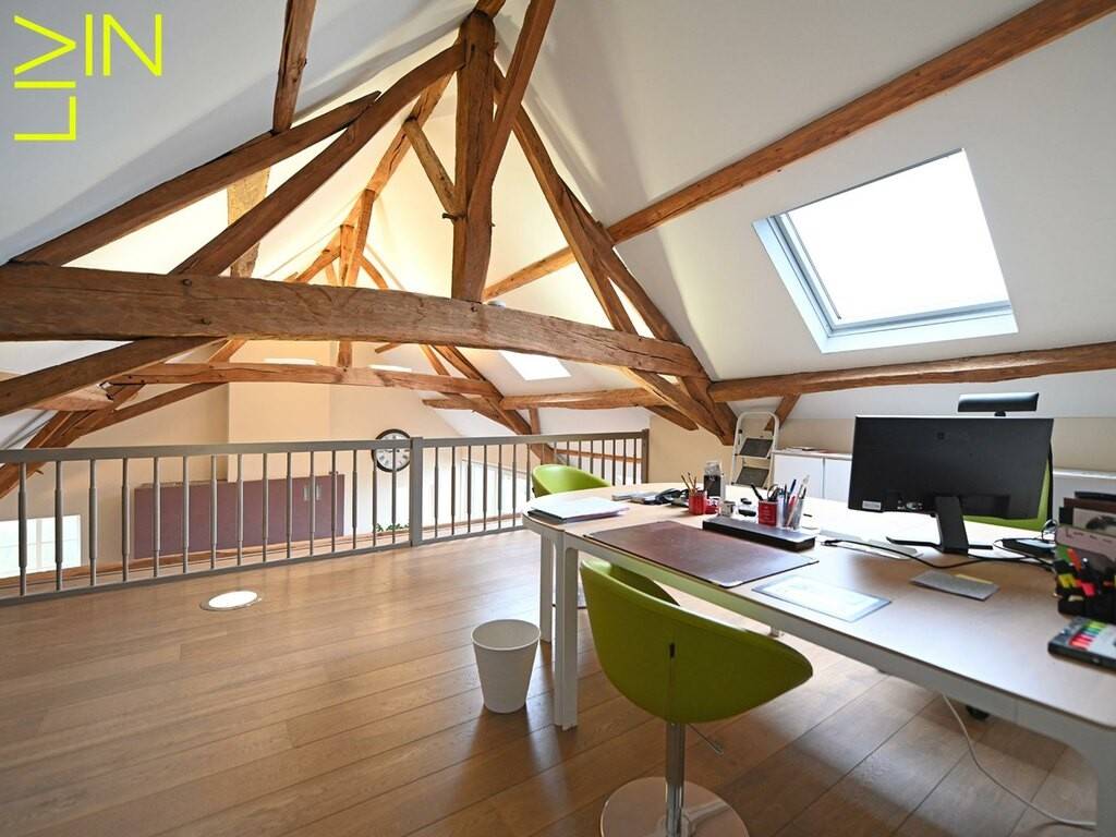 The second floor, which features impressive exposed beams, consists of a large, bright living room with triple exposure, numerous skylights, and a bay window leading to a roof terrace, a master suite with its own bathroom (shower and bathtub), a large mezzanine office space, a fireplace, and a separate toilet. These spaces remain flexible depending on the needs of the future owner and can be easily converted to create a fifth bedroom or a studio.