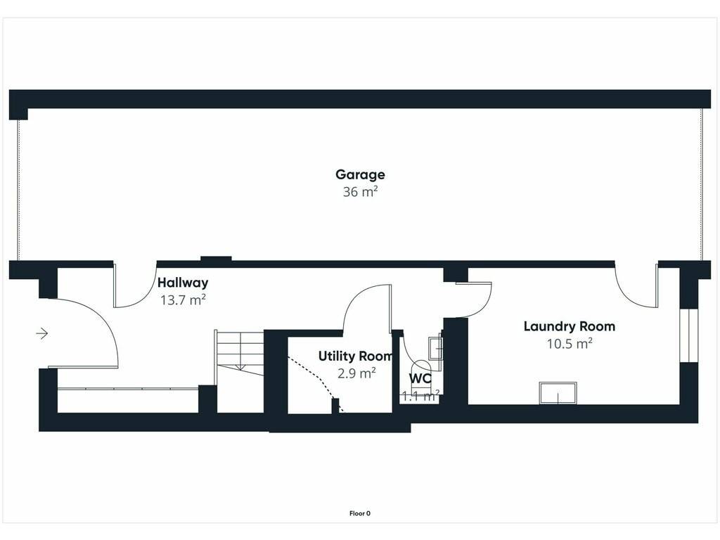 First floor: entrance hall (13.7 sqm) - boiler room (2.9 sqm) - laundry room (10.5 sqm) - garage (36 sqm)