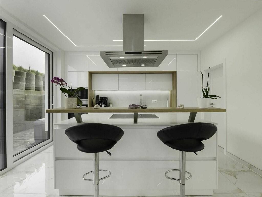 - Cuisine ouverte avec îlot central (± 5,03 m x 4,35 m) et espace salle à manger
