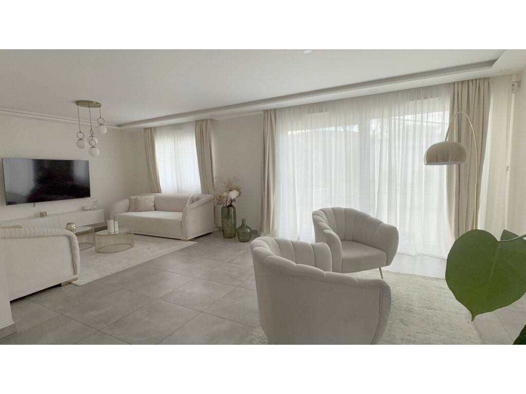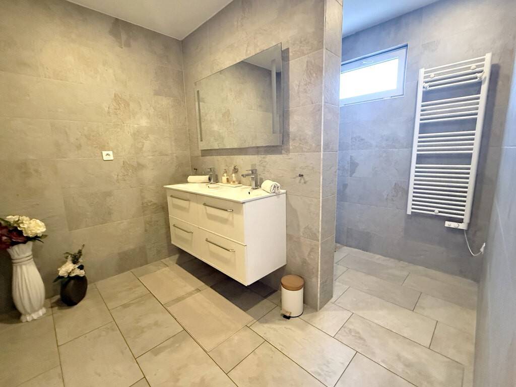 Un hall d’accueil, un vaste espace de vie carrelé et lumineux de plus de 60 m² avec sa cuisine entièrement équipée ouverte sur le séjour accédant directement à la terrasse exposée plein sud, un WC séparé avec lave-mains & Chaufferie