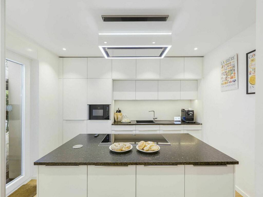 Cuisine moderne avec nombreux rangements et accès terrasse