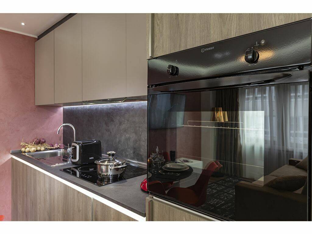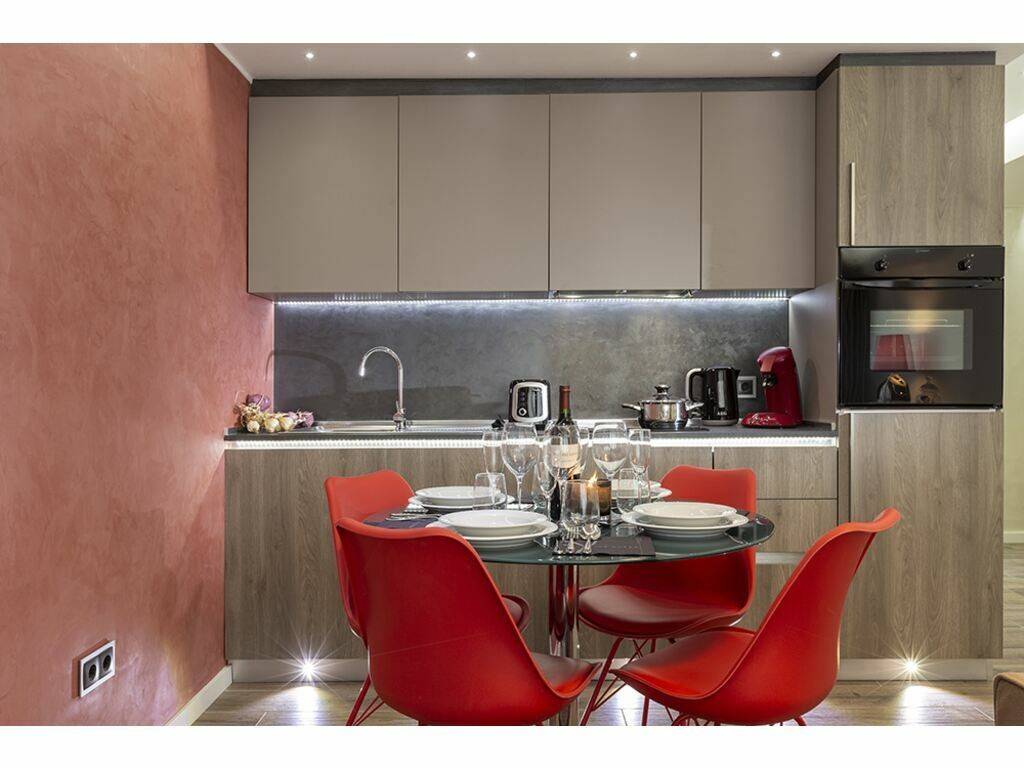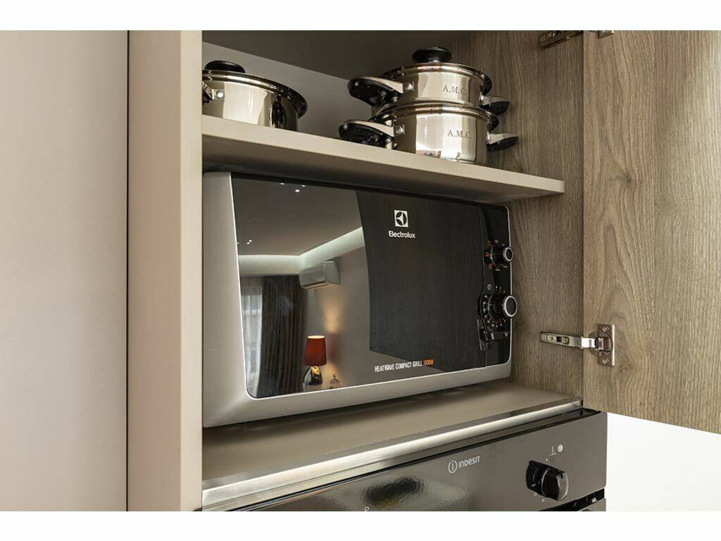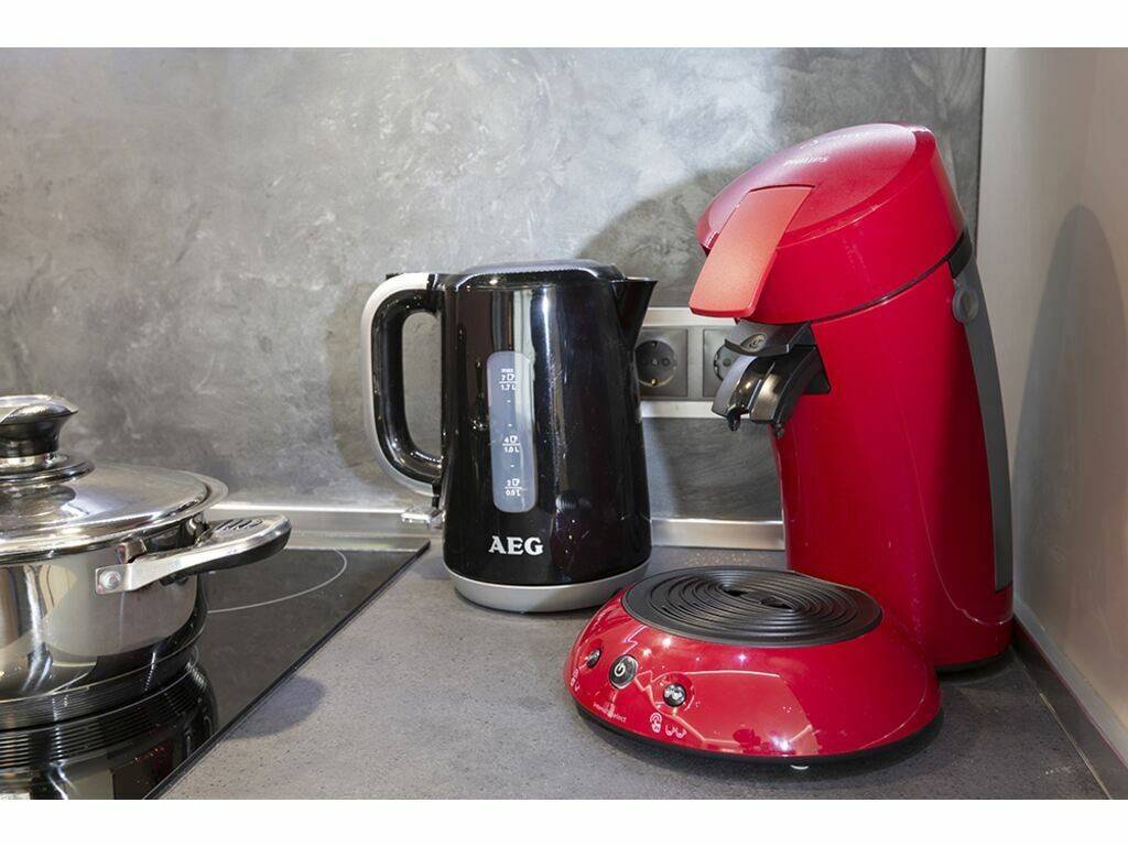 Einer voll ausgestatteten offenen Küche (Kühlschrank, Backofen, Kaffeemaschine und Küchenutensilien usw.)