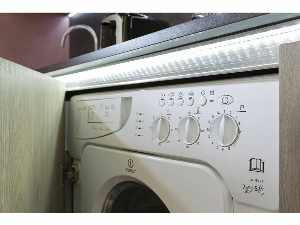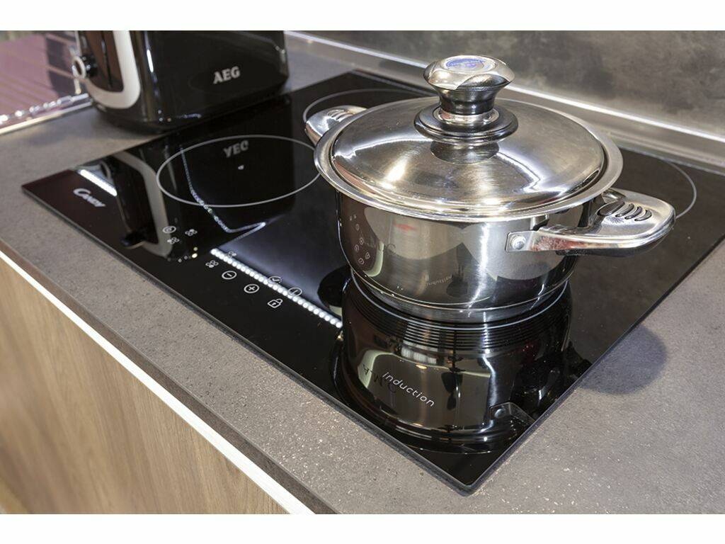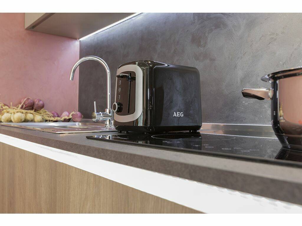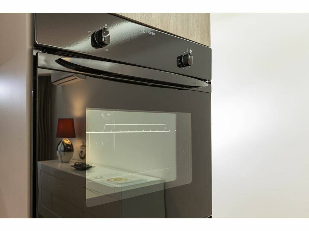Einer voll ausgestatteten offenen Küche (Kühlschrank, Backofen, Kaffeemaschine und Küchenutensilien usw.)