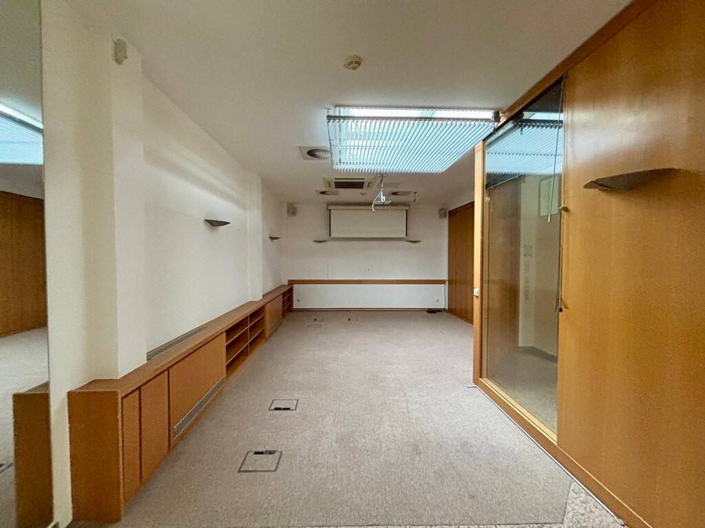 Hall d'accueil spacieux d'environ 44 m², bureau à l'avant, deux bureaux à l'arrière, kitchenette et grande salle de réunion lumineuse.