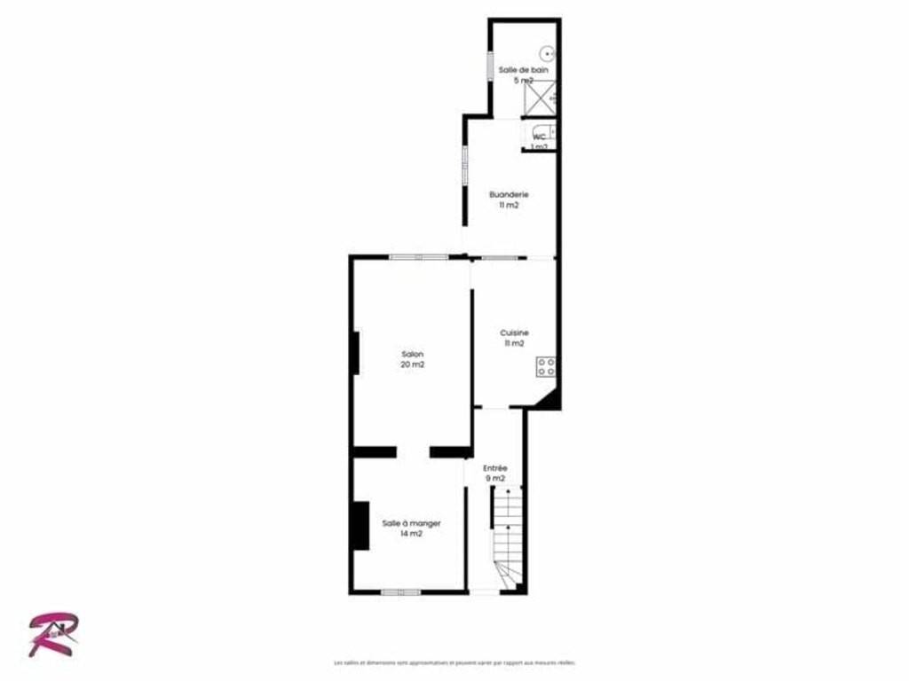 Le bien se compose comme suit : Au rez-de-chaussée : Un hall d'entrée, une salle à manger 14m² en enfilade se trouve un salon de 20m², une cuisine équipée de 11m² donnant accès à une buanderie avec WC et une salle de douche ; Au premier étage : 3 Chambres de 12m², 19m² et 20m² ; Au deuxième étage : 1 grenier aménageable en quatrième chambre mansardée de 21m² (accessible via la 3ème chambre) Sous-sol : Deux caves de 12m² et 59m² ; Extérieurs : Une terrasse de 23m² et d'un jardinet de 32m² ;