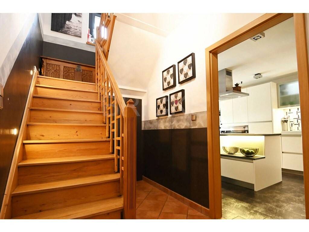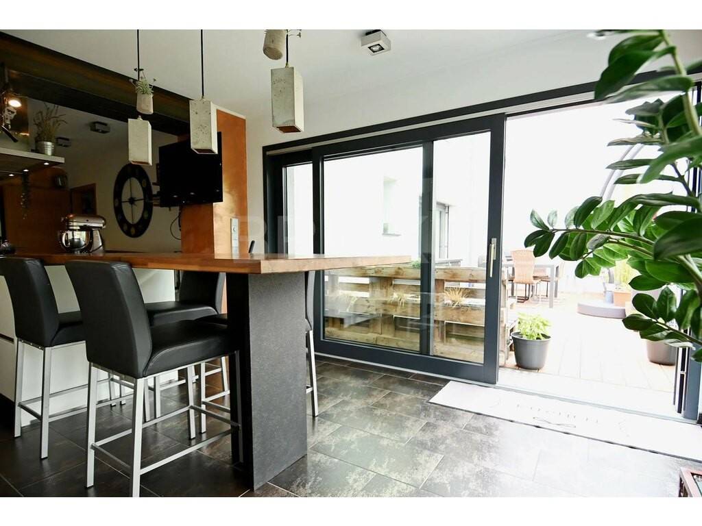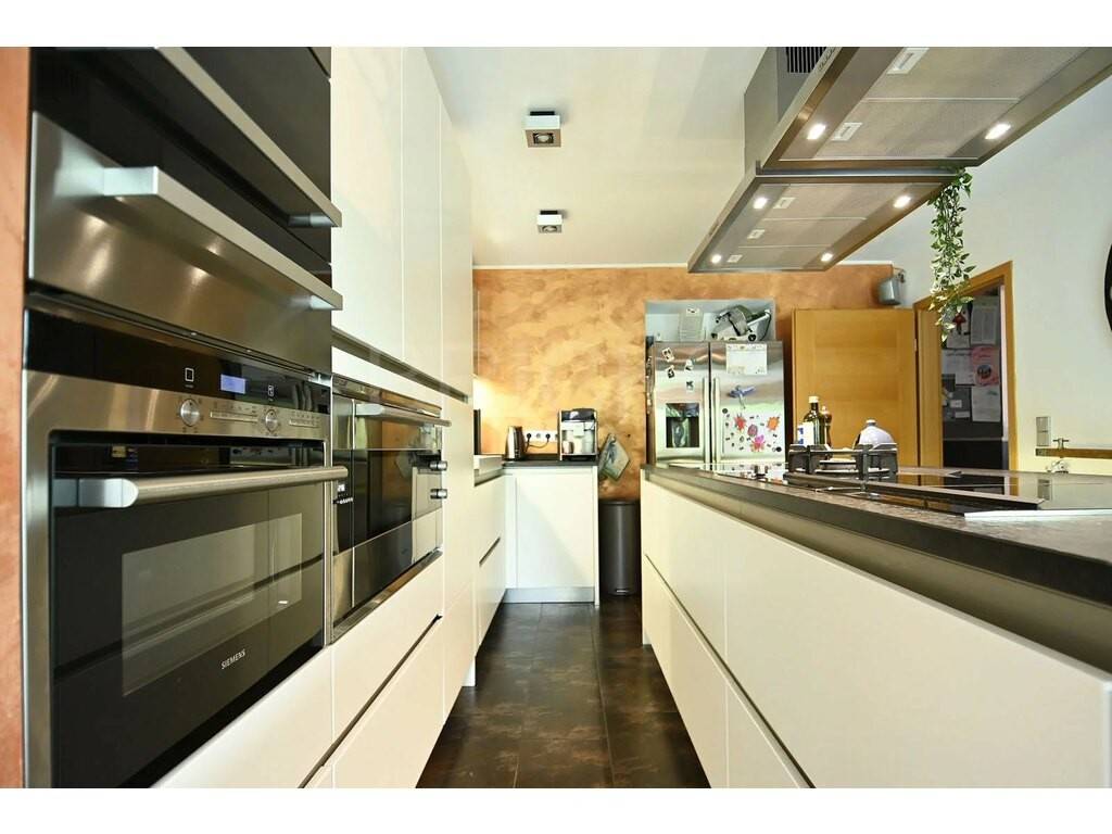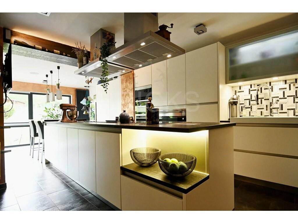Au rez-de-chaussée : Hall d’entrée avec WC invités et un espace vestiaire ; un bureau ; une cuisine haut de gamme entièrement équipée avec partie salle à manger qui dispose d’un accès direct sur une véranda et sur la terrasse donnant accès au jardin situé à l’arrière de la maison ; un vaste séjour de 40,5m2. Plusieurs emplacements de parking devant la maison.