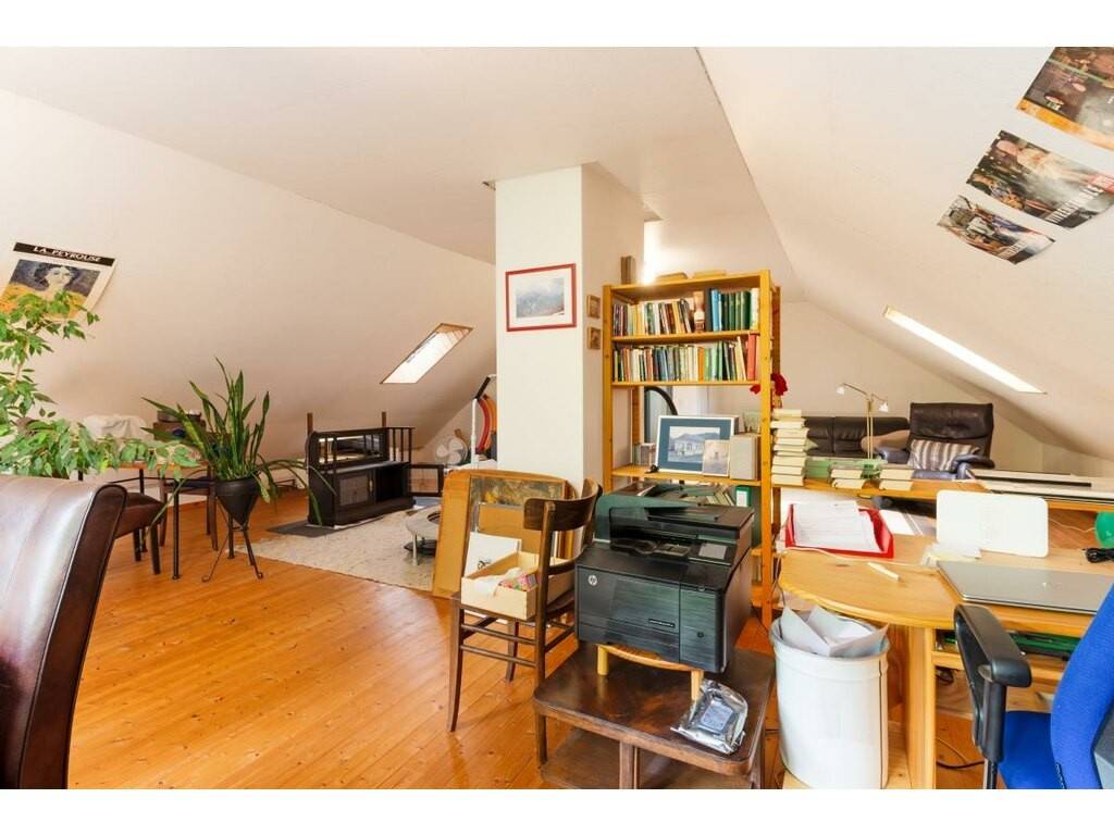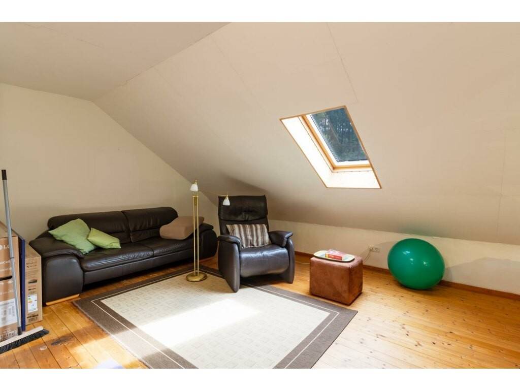 Diesem Bereich ist die geräumige Küche von ca. 12 m² mit zugeordnetem Ab-stellraum angegliedert. Über den Wohnbereich gelangen Sie in den separaten Schlaftrakt. Dieser besteht aus dem großzügigen Elternschlafzimmer von ca. 20 m² mit Ausgang auf den Balkon, dem Familienbad mit Fenster von ca. 7 m² sowie ein weiteres Schlafzimmer bzw Kinderzimmer von ca. 17 m². Von der zentralen Diele mit Garderobe erreichen Sie das Gäste-WC mit Fenster sowie den Zugang zum Dachgeschoß. Über den zentralen Flur erreichen Sie sich das großzügige Studio , ein Büro/Kinderzimmer von ca. 18 m², das Kinderduschbad von ca. 4 m² sowie ein weiteres Kinderzimmer/Büro von ca. 14 m². Dieser Bereich könnte als separate Wohnung genutzt werden. Das Haus ist teilunterkellert. Hier befindet sich die Garage, ein Hobbyraum, der Waschraum sowie die Technik mit Heizung und Tankraum. Das Haus wird beheizt mit einer Ölzentralheizung.