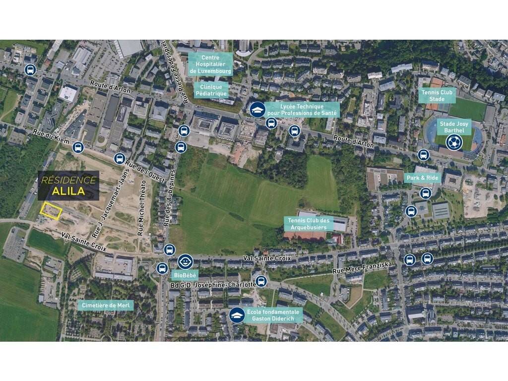 Das Stadion Josy Barthel befindet sich 1,4 km von der Wohnanlage entfernt. Es ist zum Abriss verurteilt, da das neue Stadion in Luxemburg im Jahr 2022 in Betrieb genommen wurde. Das alte Stadion soll durch Wohnungen ersetzt werden.