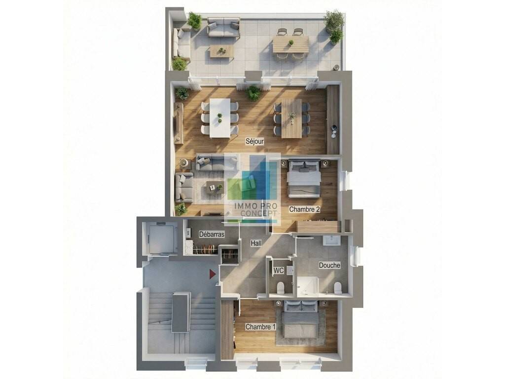 • Terrasse avec espace de rangement : Une superbe terrasse de 26.82 m² complète ce bien, offrant un espace extérieur privatif pour profiter pleinement du soleil l'après-midi, se détendre ou recevoir.