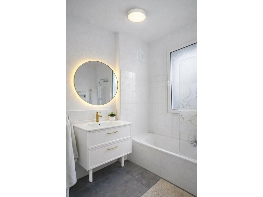 Salle de bain avec baignoire et fenêtre apportant une lumière naturelle