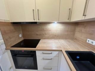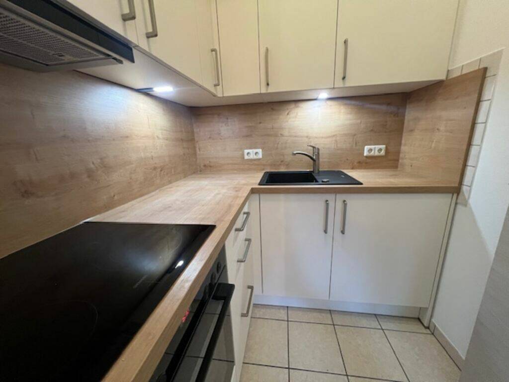 Pour ce qui est de la cuisine équipée, prenez note qu’elle est toute récente. Elle comprend un réfrigérateur (avec compartiment freezer), un four, une plaque de cuisson vitrocéramique et sa hotte). Sachez que la cuisine est séparée de la pièce de vie et sa superficie est 3 m2 (1,8 x 1,7).