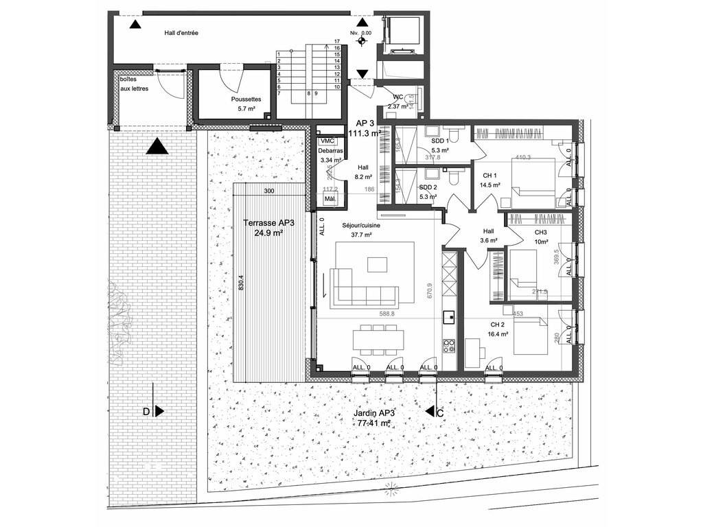 Entdecken Sie diese geräumige Wohnung mit 111 m², die modernen Komfort und großzügiges Wohnen im Freien vereint. Sie befindet sich im Erdgeschoss und verfügt über eine Terrasse und einen nach Süden ausgerichteten privaten Garten.