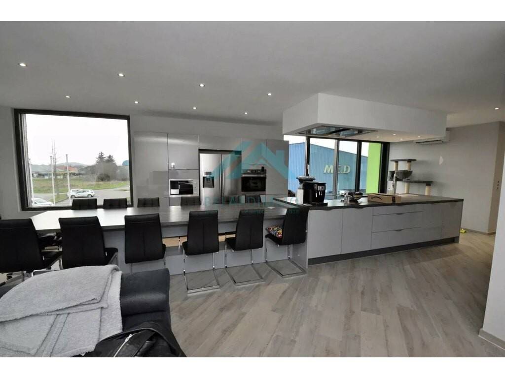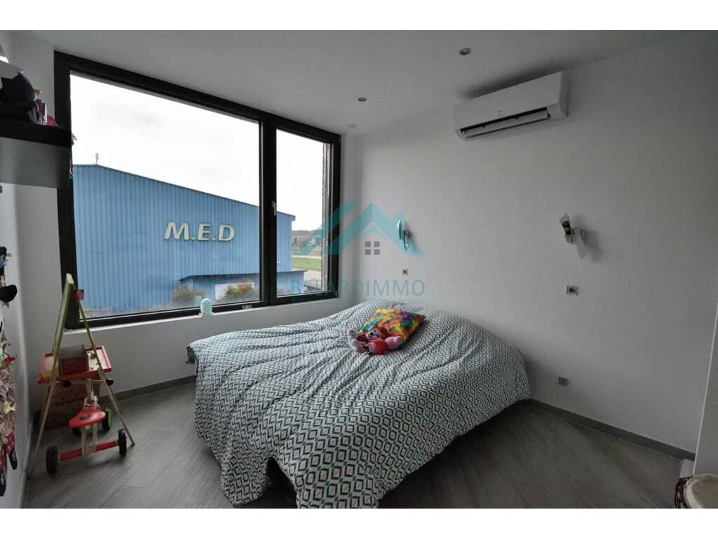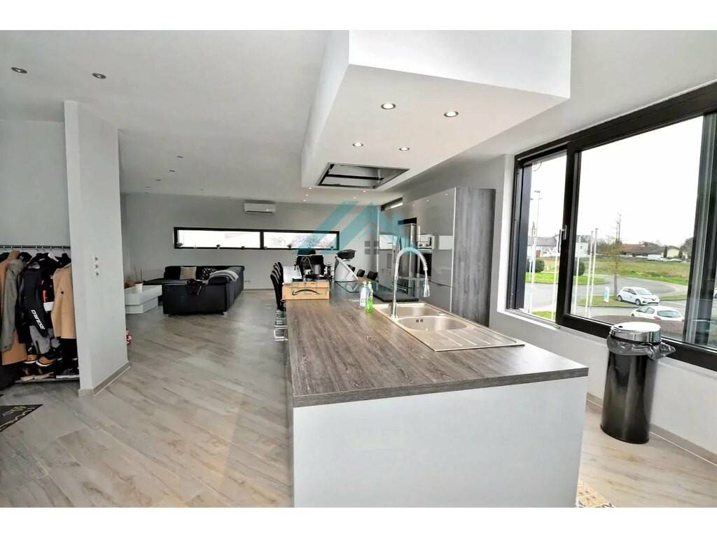 Belardimmo vous propose cette très belle maison individuelle d'architecte de 2018 (Garantie décennale) d'environ 280m² Brut dont 180m² habitables avec ascenseur, sur un terrain d'environ 16 ares avec un hangar de 270m² sur l'arrière du terrain ( anciennement garage automobile), située dans une zone d'activité économique de Cattenom Hussange qui a l'avantage d'être une zone ou il n'y a aucunes nuisances de voisinage autour de la maison, celle-ci est composée comme suit: