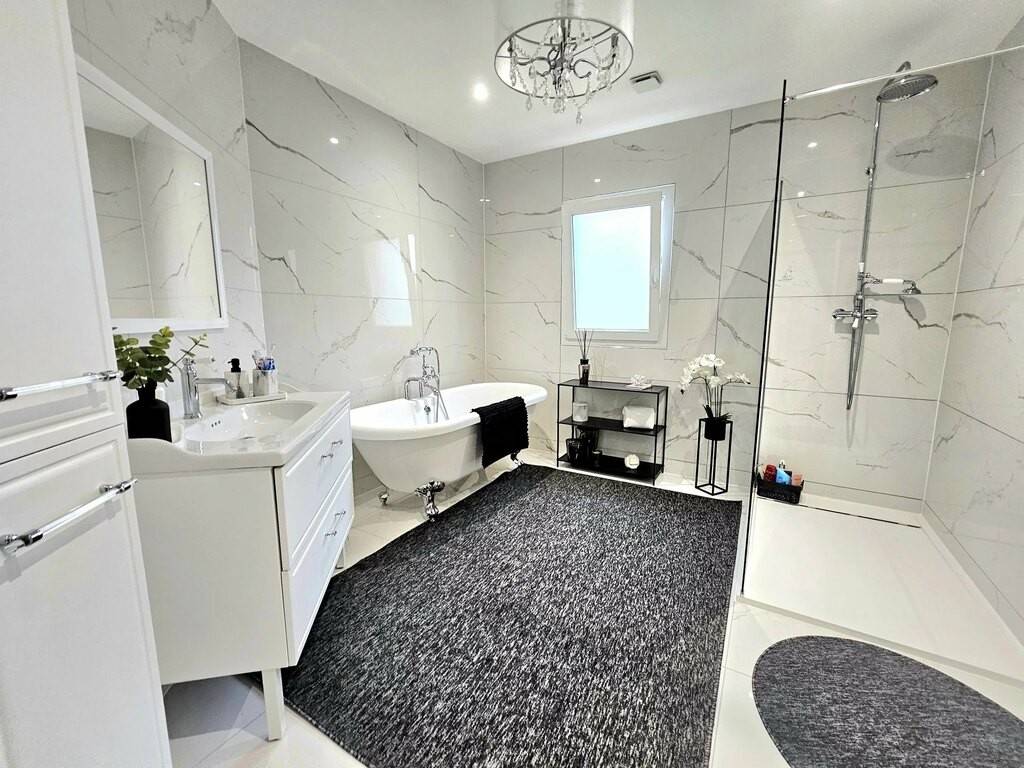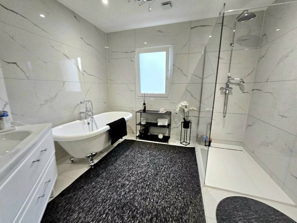 -une salle de bain de 10m2 avec douche italienne, meuble vasque et baignoire