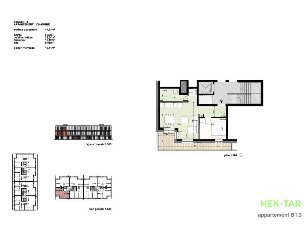 Lot B 1.3 is a one-bedroom apartment on the 1st floor, offering 47.53 m² of interior space and a 12.44 m² north-facing balcony/terrace. An indoor parking space is included in the price.