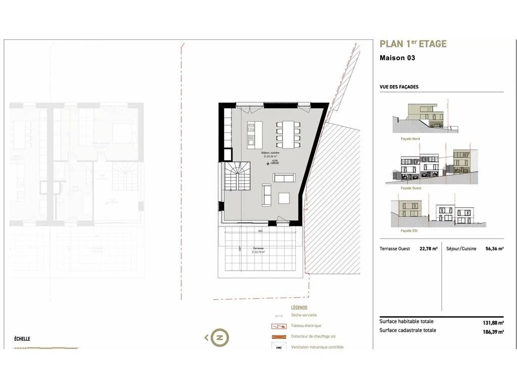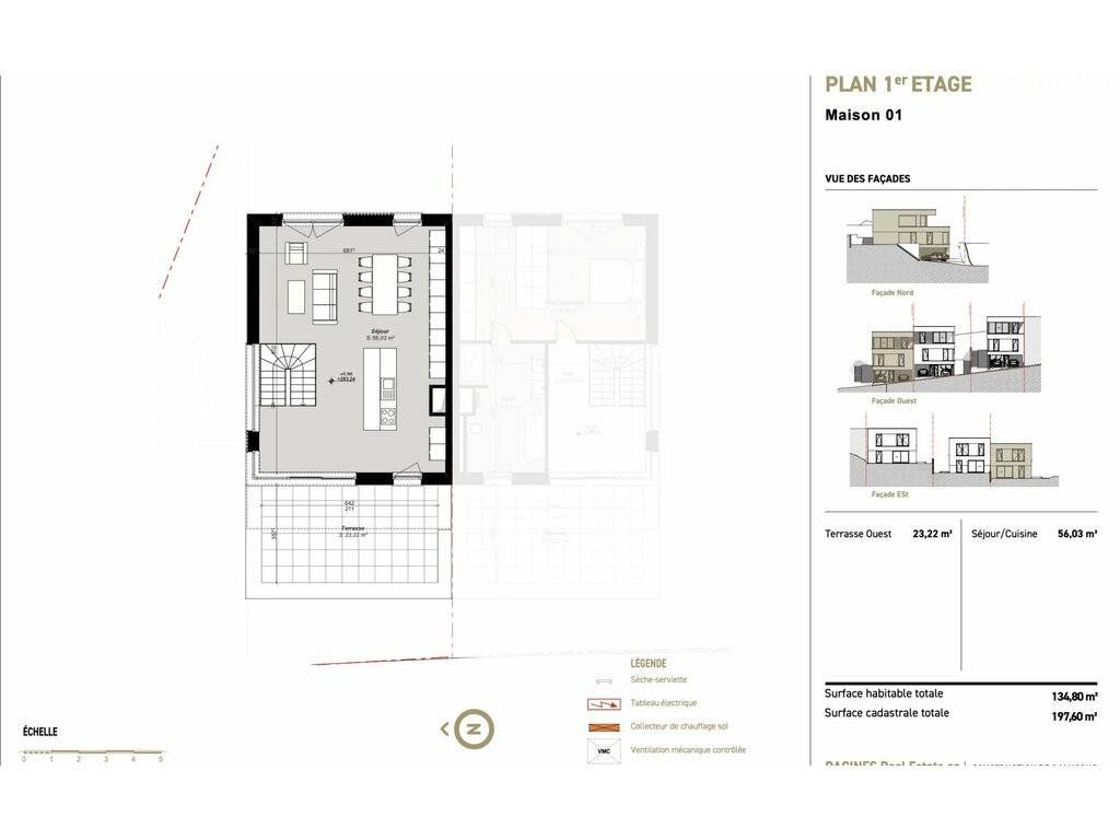 Im ersten Stock befindet sich ein großer Raum (56,03 m2), der als Küche und Wohnzimmer dient und in dem sich auch eine 23,22 m2 große Terrasse befindet.