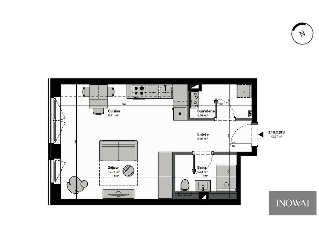 Ce studio lot 210 situé au deuxième étage a une surface habitable de 42.57 m².
