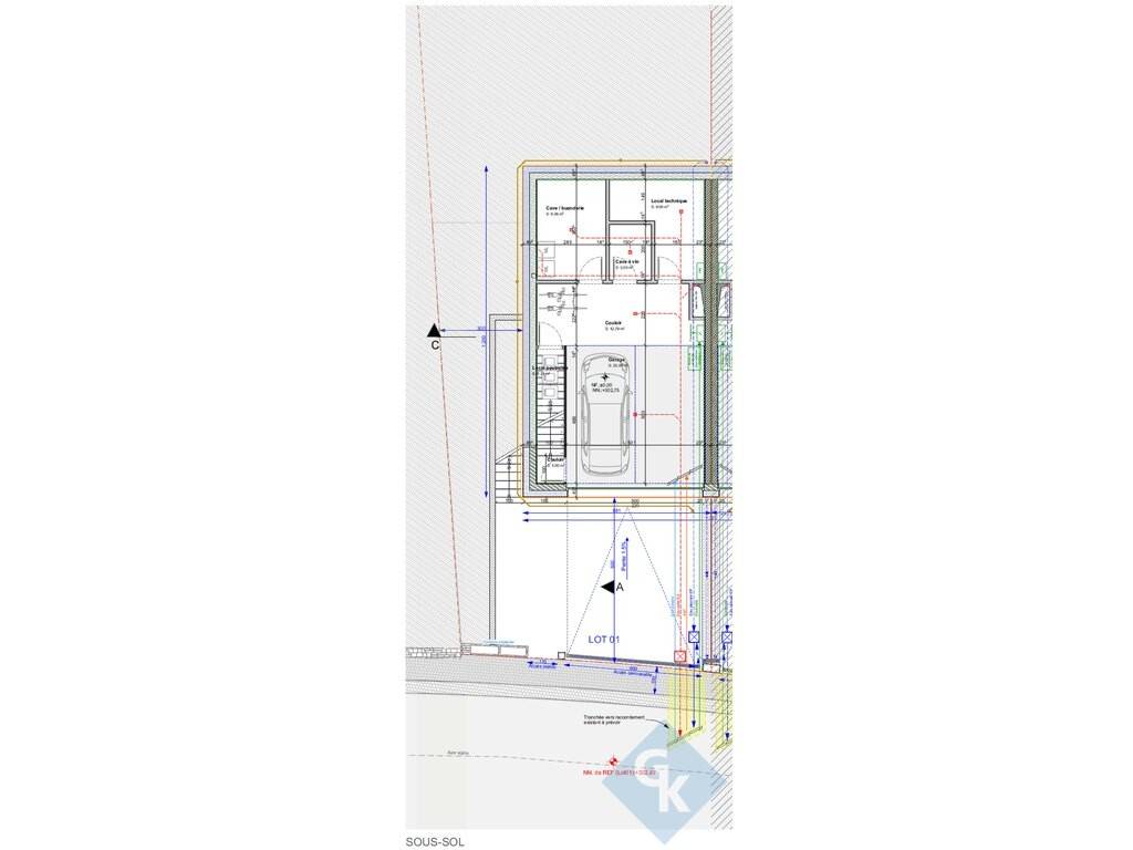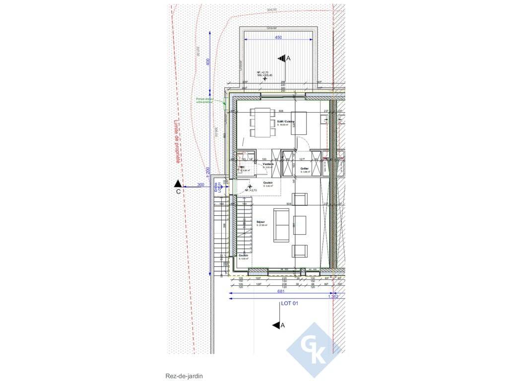Au RDCH : garage pour 2 voitures (25,09 m²) ; couloir (12,79 m²) ; cave/buanderie (9,06 m²) ; cave à vin (3,00 m²) ; local technique (9,00 m²) ; local poubelles (1,21 m²) ; 2 parkings extérieurs.