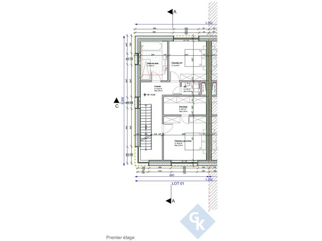 2ième étage : hall de nuit (12,22 m²) ; salle de bain (9,09 m²) ; chambre 1 (12,49 m²) ; WC séparé (2,04 m²) ; chambre 2 (16,00 m²) avec dressing (6,67m²).