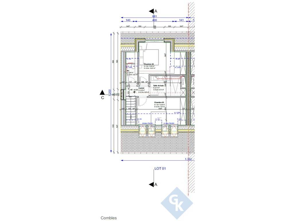 3ième étage : hall de nuit (2,28 m²) ; chambre 3 (13,93 m²) ; chambre 4 (13,28 m²) ; salle de bain (6,73 m²) ; WC séparé (2,49 m²)