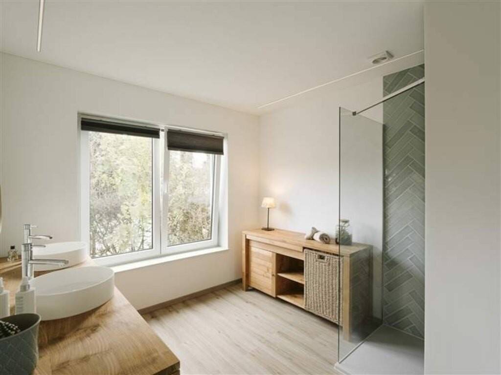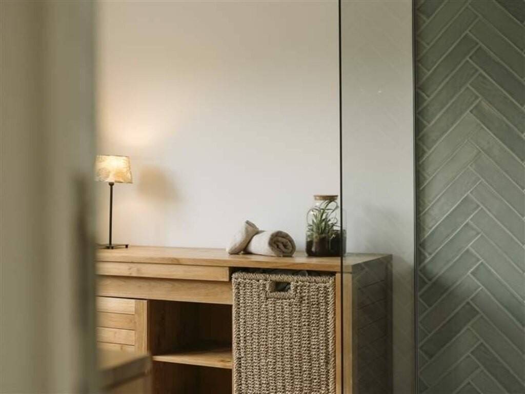 Ensuite, la récente et ravissante cuisine entièrement équipée, suivie d'une superbe salle-de-bain rappelant le cadre extérieur, avec ses doux tons de bois et de vert.