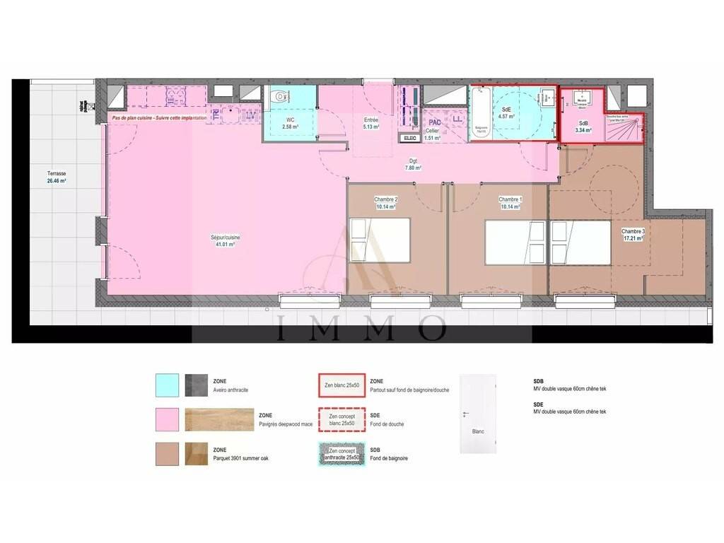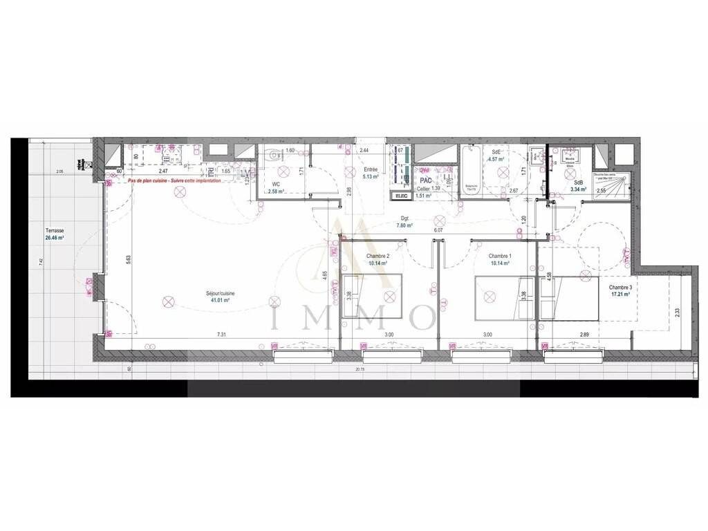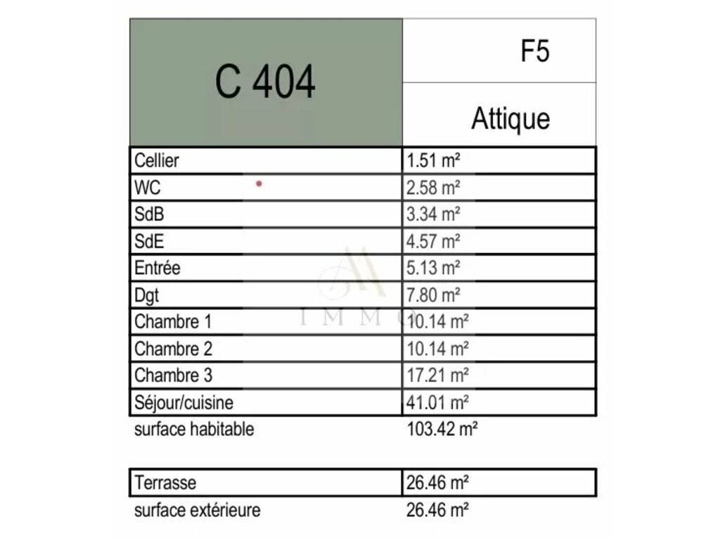 Hall d’entrée d’une surface de 5.18 m2, un WC séparé d’une surface de 2.64 m2, une salle de bain d’une surface de 3.86 m2, 3 chambres à coucher : surfaces de 10.20 et 10.20 & une chambre parentale de 16.57 m2 agrémentée d’un espace dressing et d’une salle d’eau de 4.63 m2, un séjour d’une surface de 40.83 m2 avec accès au balcon de 26.46 m2, espace cuisine ouverte sur le séjour et sur la terrasse, espace PAC + emplacement pour lave-linge et sèche-linge puis un dégagement de 7.50 m2