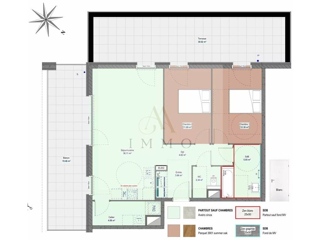Hall d’entrée d’une surface de 3.66 m2, un WC séparé d’une surface de 2.34 m2, une salle de bain d’une surface de 5.93 m2, 2 chambres à coucher : surface de 11.69 & 12.38 m2, un séjour d’une surface de 30.11 m2 avec accès au balcon de 19.46 m2 et à la terrasse de 30.02 m2, espace cuisine ouverte sur le séjour, espace rangements avec emplacement pour lave-linge, un dégagement de 4.82 m2 et un cellier de 4.99 M2