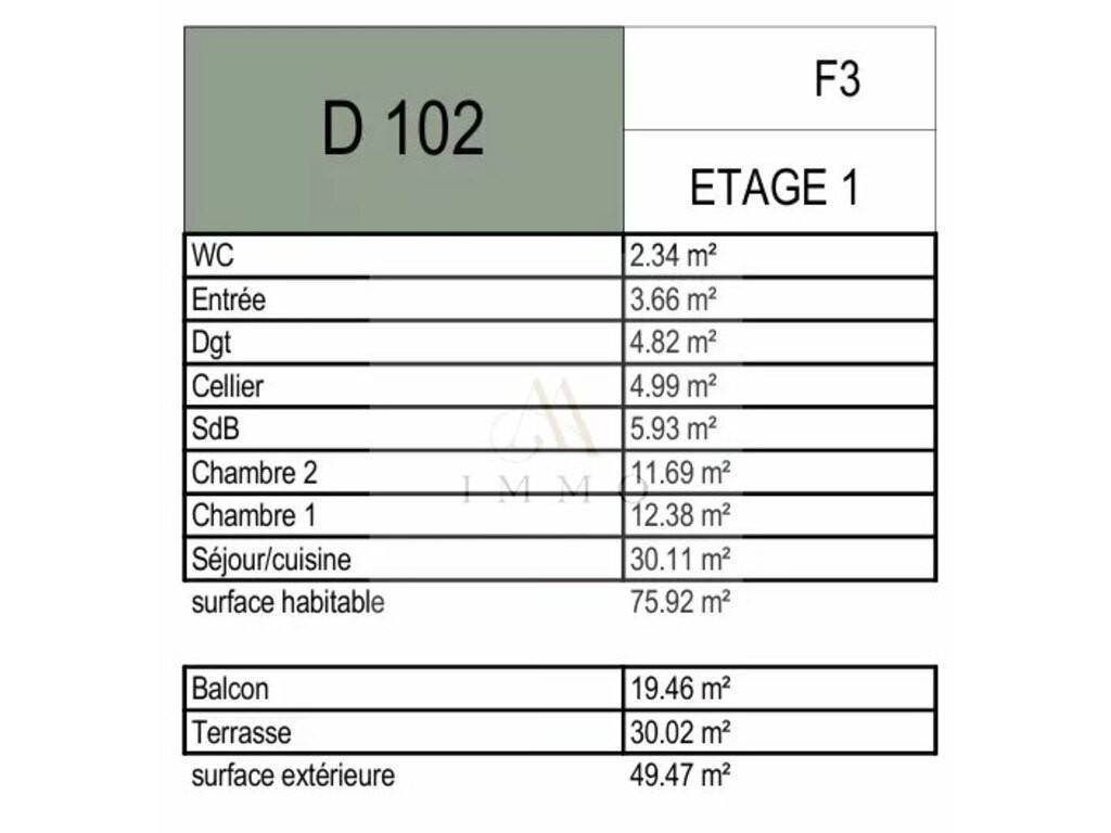 Situé au 1er étage de la Résidence AERIS - Appartement N° D 102 de Type F3, d’une surface habitable de 75.92 m2 + un balcon de 19.46 m2 et une terrasse de 30.02 m2, affiché au prix de 280 000 € TVAC (20%)