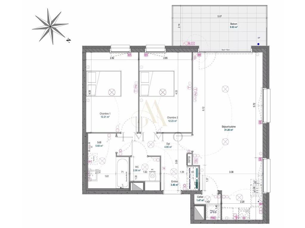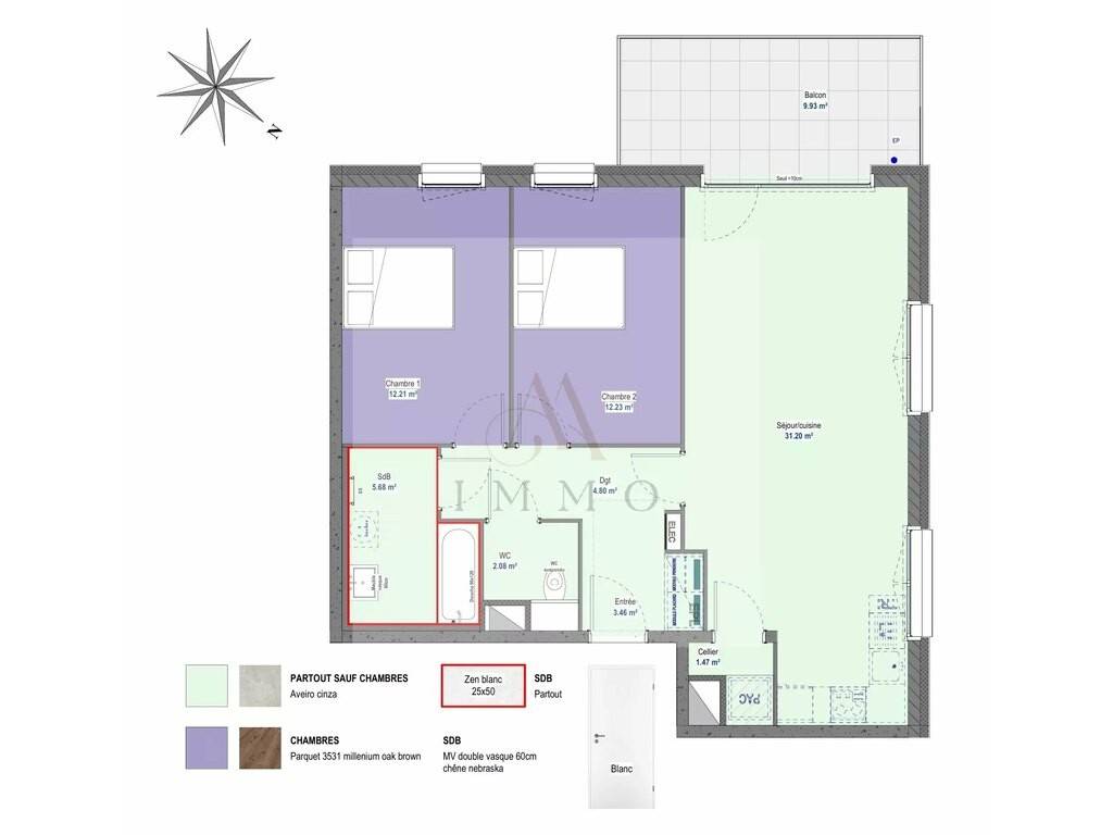 Hall d’entrée d’une surface de 3.46 m2, un WC séparé d’une surface de 2.08 m2, une salle de bain d’une surface de 5.68 m2, 2 chambres à coucher : surface de 12.21 & 12.23 m2, un séjour d’une surface de 31.20 m2 avec accès au balcon de 9.93 m2, espace cuisine ouverte sur le séjour, espace rangements avec emplacement pour lave-linge, un dégagement de 4.80 m2 et un cellier de 1.47 M2