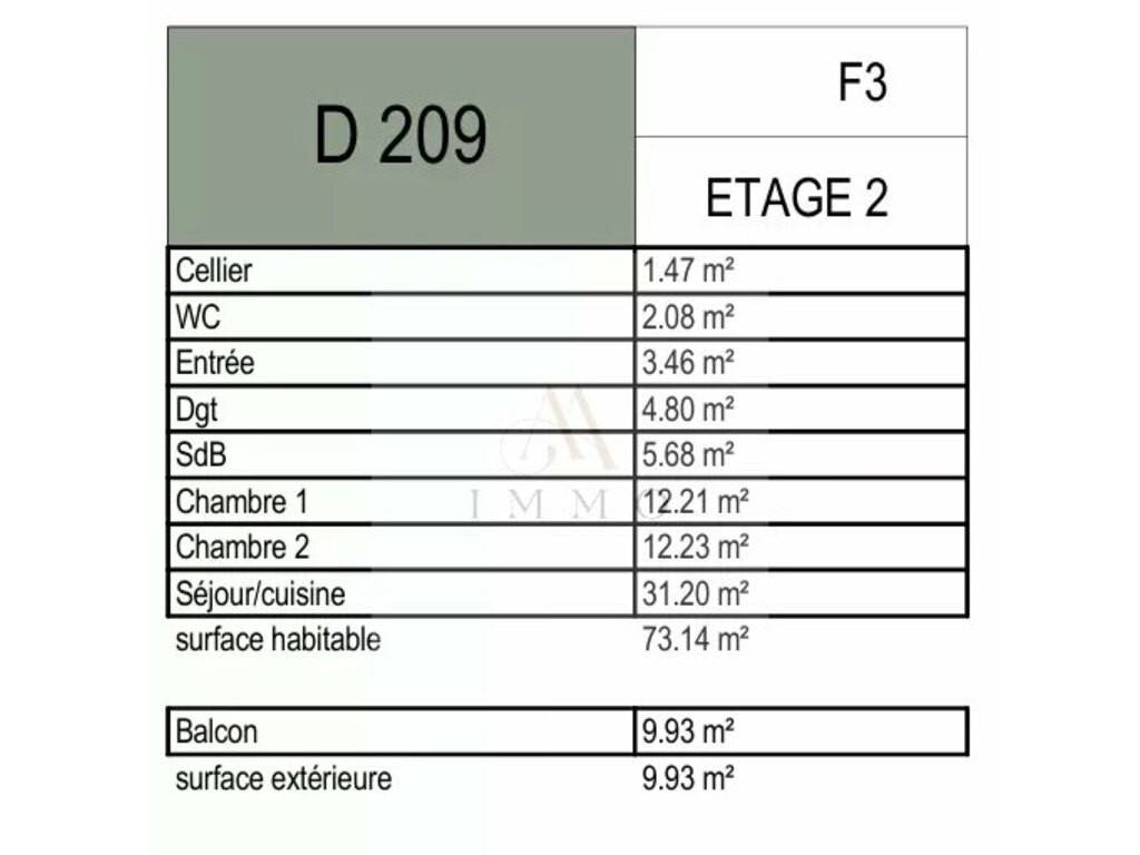 Situé au 2ème étage de la Résidence AERIS - Appartement N° D 209 de Type F3, d’une surface habitable de 73.14 m2 + un balcon de 9.93 m2, affiché au prix de 233 750 € TVAC (20%)