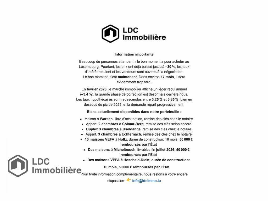 You can contact us by email at info@ldcimmo.lu or by phone at (+352) 27 86 42 42. Sale Details - Thermal protection class: D
