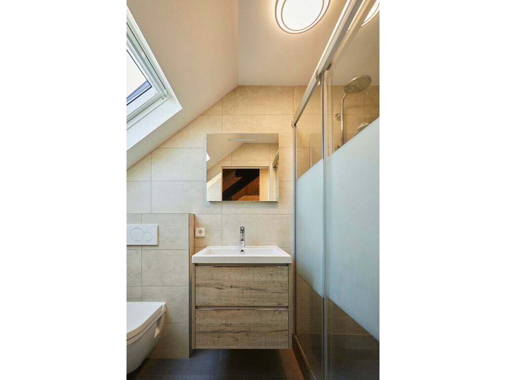 The ground floor opens onto an entrance hall with guest toilets leading to a spacious, light-filled living and dining room, as well as a separate fully equipped kitchen. The kitchen provides direct access to a pleasant rear terrace that extends into a small, private garden—perfect for enjoying sunny days.