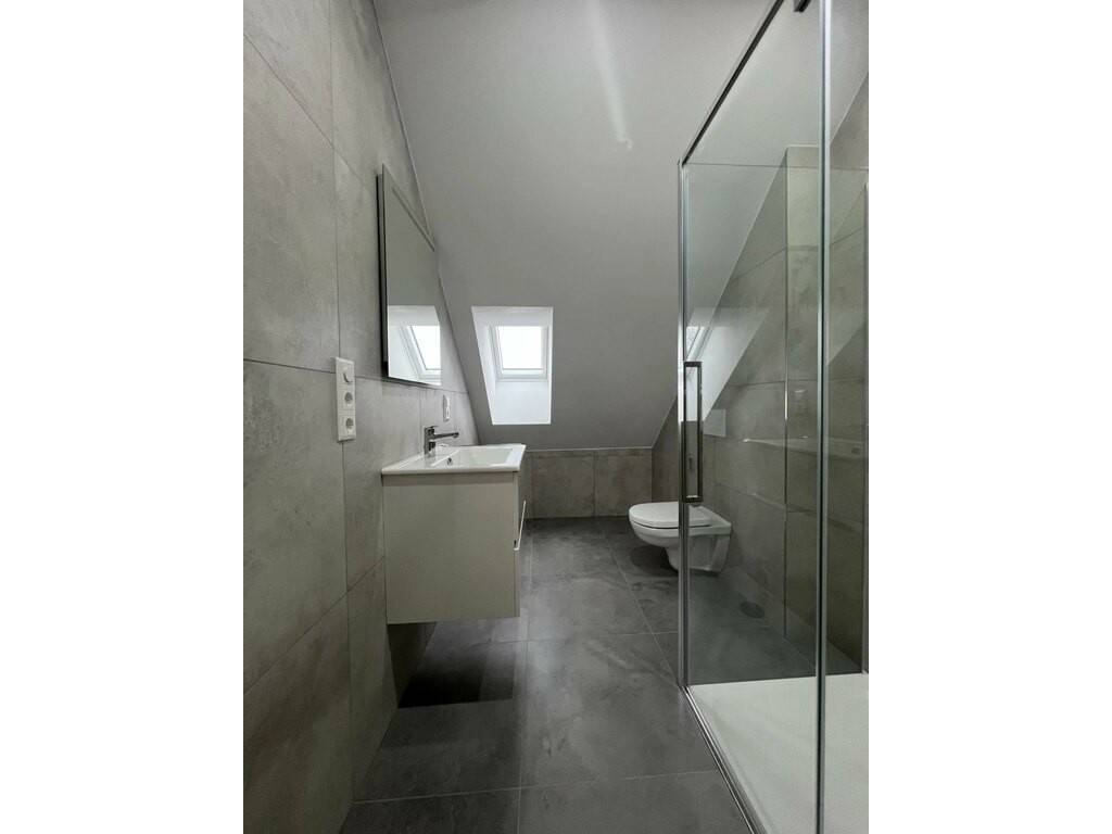 À l’étage supérieur, un couloir lumineux d’environ 5 m² mène à trois belles chambres de 12, 13 et 31 m². La plus grande bénéficie de sa propre salle de douche privative de 5 m² avec WC et lavabo. Une seconde salle de douche spacieuse de 7 m² vient compléter l’ensemble.