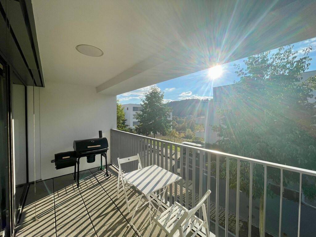 Accès direct à un grand balcon couvert, idéal pour se détendre,