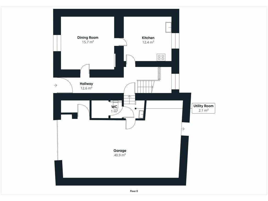 Ground floor: entrance hall (12.6m²) - dining room (15.7m²) - kitchen (12.4m²) - separate toilet (1m²) - closed garage (41m²)