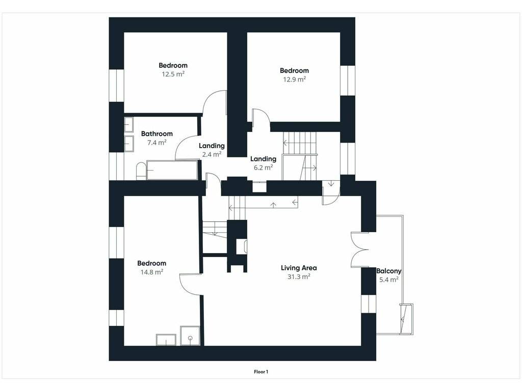 First floor: hall (8.6m²) - living room with ceiling height over 3m (31m²) - 3 bedrooms (14.8m² + 12.9m² + 12.5m²) - bathroom (7.4m²)