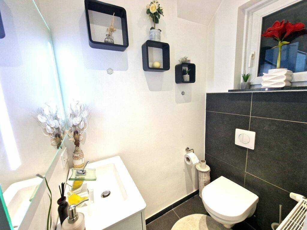 À l’étage, l’espace nuit se compose de trois chambres élégantes, offrant intimité et sérénité. La salle de bains moderne avec douche italienne incarne le confort haut de gamme, alliant design et fonctionnalité.