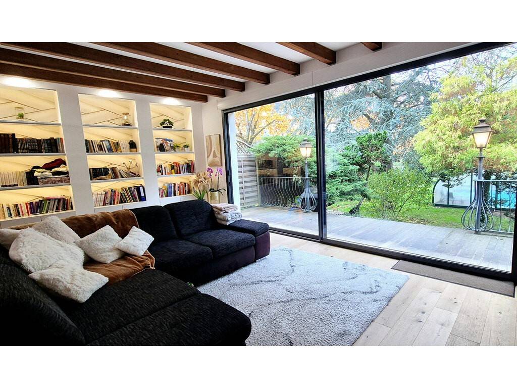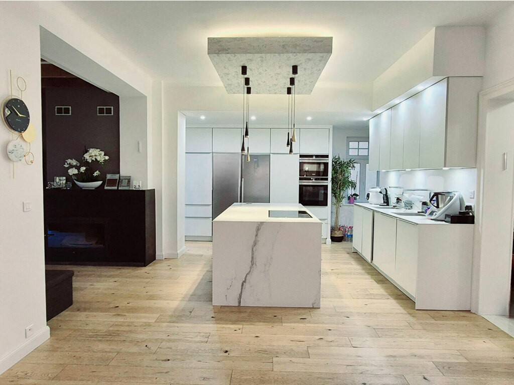 Le rez-de-chaussée s'articule autour d'une extension contemporaine spectaculaire, véritable coeur de la maison : grande pièce de vie avec baie vitrée, cheminée et cuisine américaine haut de gamme.