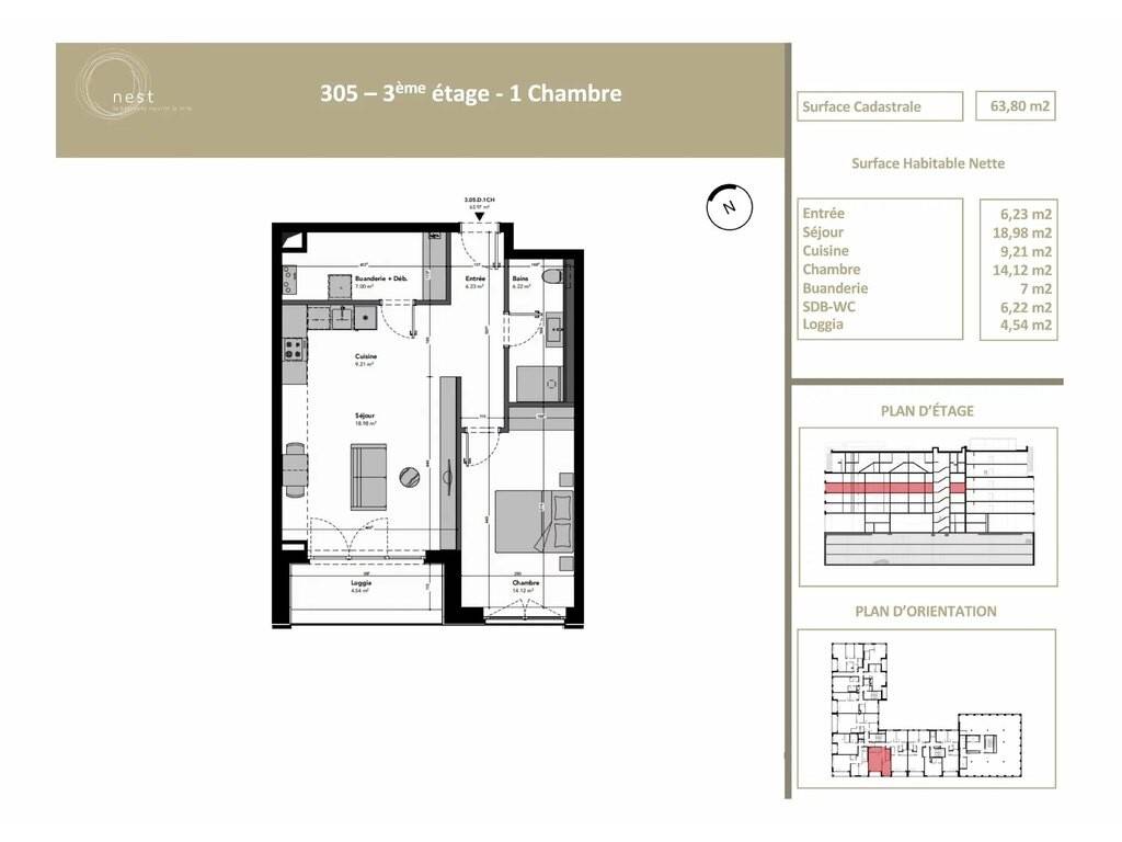 Die Wohnung Lot 3.05.D.1CH befindet sich im 3. Stock und verfügt über eine Katasterfläche von ±63,80 m², eine Loggia von ±4,54 m² und ist wie folgt aufgeteilt: