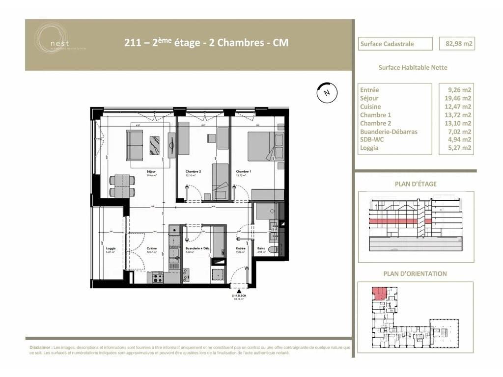 Die Wohnung Lot 2.11.D.2CH befindet sich im 2. Stock und verfügt über eine Katasterfläche von ±82,98 m², eine Loggia von ±5,22 m² und setzt sich wie folgt zusammen: