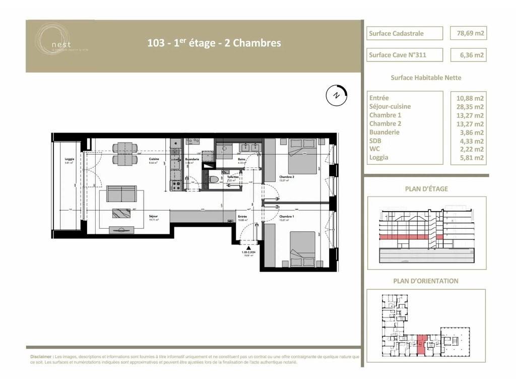 Die Wohnung Lot 1.03.C.1CH befindet sich im 1. Stock und verfügt über eine Katasterfläche von ±78,69 m², eine Loggia von ±5,81 m² und setzt sich wie folgt zusammen:
