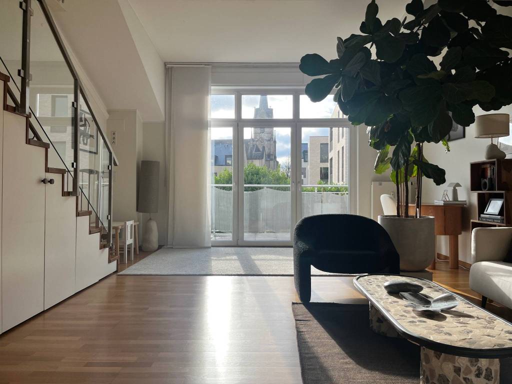 - une mezzanine ajoute une troisième chambre et un espace polyvalent (bureau, espace yoga), accessible par un escalier en bois doté d'une nouvelle rampe en verre et acier (année de construction : 2024).