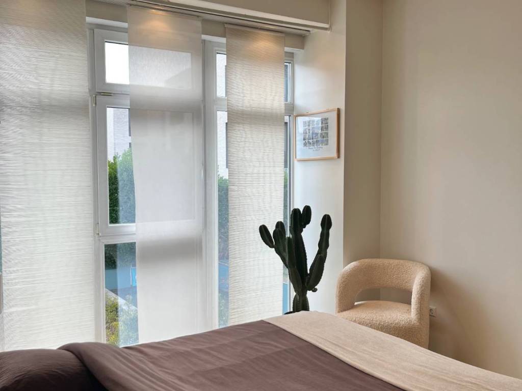 - two bedrooms with large windows and high ceilings,