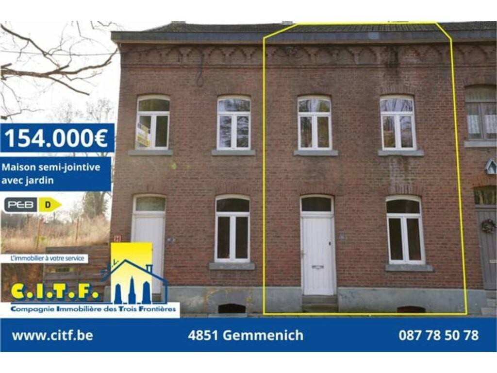 Très chouette maison jointive avec jardin idéalement ensoleillé sise Rue de L’Eglise 60 à 4850 Plombières. PEB : D - PEB no. 20251202014550- E Spec: 308 kWh / m².an - E total : 33761 kWh / an Composition du bien : L’entrée s’effectue par l’avant où se trouve le living équipé d’un poêle à pellets, la lumineuse cuisine équipée comprend l’escalier menant à l’étage et permet l’accès à l’extérieur et au jardin. L’étage est composé d’un hall de nuit, d’un wc séparé, d’une grande chambre à coucher (qui pourrait être divisée en deux) et d’une salle de bain composée d’une douche, d’un lavabo et des accès pour machine à laver. Le second étage est composé d’une spacieuse chambre à coucher (33m²) qui profite de la belle hauteur sous toiture et qui pourrait être aménagée en plusieurs pièces de vie. Le sous-sol comprend une cave voutée avec le boiler électrique pour l’eau chaude. Les fenêtres sont en PVC double vitrage, l’installation électrique est conforme, le sol du rez est recouvert de carrelages, à l’étage de laminés. Le jardin est idéalement situé au point de vue de l’ensoleillement et de l’espace naturel situé à l’arrière de la propriété. C’est un bon bien pour un premier achat ou pour tout investissement ! Le bien voisin est également à vendre et permettrait la transformation de deux biens en un ou de tout autre projet immobilier dans la limite des autorisations urbanistiques. Il y a la possibilité d’acquérir plus de terrain/jardin, les propositions et projets de géomètre seront di Sale Details - Honoraires à la charge: Non communiqué